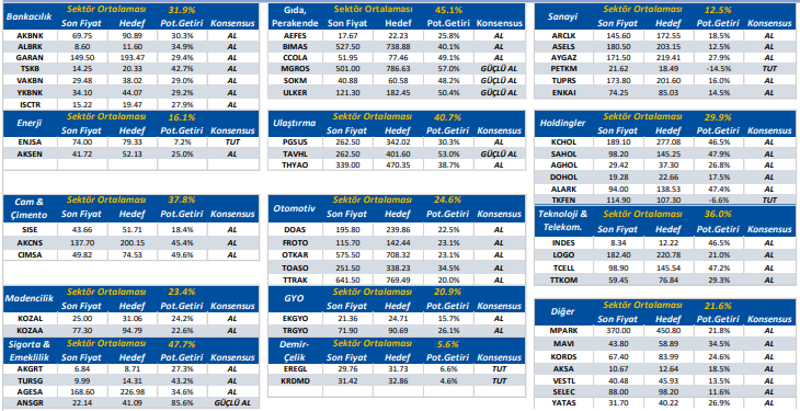 Not: Yukarıda yer alan hedef fiyatlar, potansiyel getiriler ve konsensus önerileri, Halk Yatırım öneri ve beklentileri değildir. Bu veriler, Reuters, Matriks, Bloomberg vb. güvenilir olduğuna inanılan ve en az 3 analist tarafından paylaşılan hedef fiyat ve tavsiyeler olup bilgi paylaşımı amacıyla listelenmiştir.