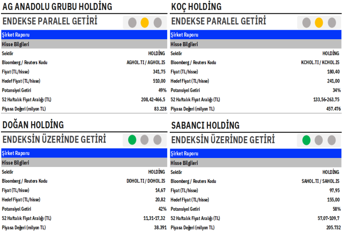 AG Anadolu Grubu Holding: Şirket payları için önerimizi “Endekse Paralel Getiri” olarak güncelliyoruz; güncel adil değer hesaplamamız 510,00TL/pay ile %49’luk nominal getiri potansiyeli sunmaktadır. Anadolu Efes tarafındaki belirsizliklerin netleşmesinin ve finansallara olası etkilerinin belirginleşmesinin ardından Şirket için önerimizi yeniden gözden geçireceğiz. Değerleme girdilerinden birisi olan Anadolu Efes varsayımlarımızda henüz herhangi bir değişikliğe gitmiyoruz. Şirket payları, 2025 varsayımlarımıza göre 4,2x F/K ve 0,65x PD/DD çarpanları ile işlem görmekte olup; özkaynak kârlılığı ise yaklaşık %15 seviyesindedir. Net aktif değer (NAD) iskontosu ~%37’dir. Çeşitlendirilmiş hızlı tüketim ürünleri (FMCG) ağırlıklı portföyü nedeniyle Şirket paylarını defansif bir yatırım aracı olarak değerlendiriyoruz ve bu nedenle gelecekte daha dar bir iskonto ile işlem görebileceği kanaatindeyiz. Ayrıca grup, son birkaç yılda karşılaşılan enflasyonist baskıları tüm segmentlerde iyi yönetilmiş bir fiyatlandırma stratejisi ile aşarak pandemi sonrası dönemde önemli ölçüde borç azaltımı sağlamıştır. AGHOL payları, BIST100 göreceli olarak yılbaşından bu yana (YBB) %30’luk getiri sağlamıştır. (2023: +%35)