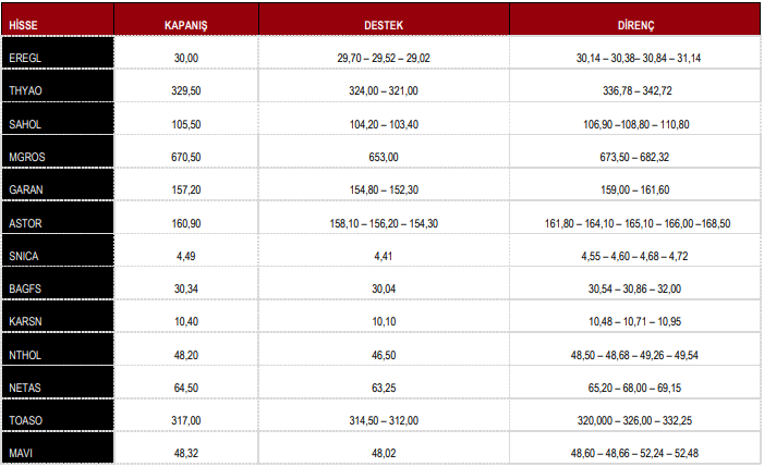 BIST100 endeksinde 13.739-13.620, 13.521 (boşluk) ve 13.393 seviyeleri önemli desteklerdir. 13.106 (boşluk) da destek seviyesidir. 13.998 ve kısa vadeli yükselen trend direnci olan 14.100 ve üzeri seviyelerde satış baskısı görülebilir. 14.314-14.358 seviyeleri ise sonraki dirençler olarak izlenebilir.