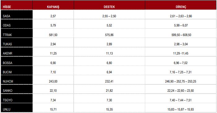 BIST100 endeksinde 13.262 Salı gününün en yüksek seviyesi, 13.106 dün bırakılan boşluk (gap), 13.053 ve 12.886-12.851 aralığı boşluk (gap) seviyesi destek olarak takip edilebilir. Yukarı yönlü hareketlerde 13.575 ve 13.645 (dolar bazında 314,3 – boşluk seviyesi) satış yönünde izlenebilir. 14.017 seviyesi ise bir sonraki direnç olarak öne çıkmaktadır.