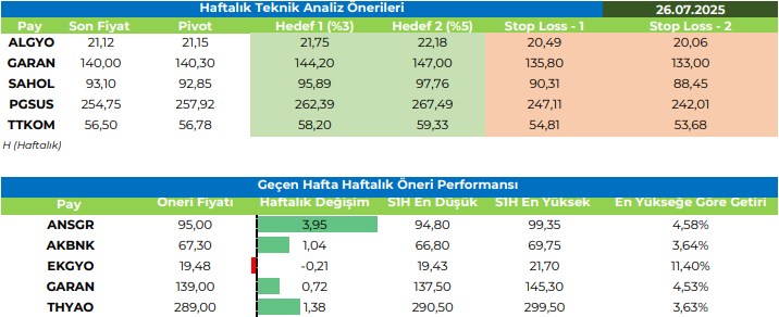 Haftalık Teknik Analiz Önerileri