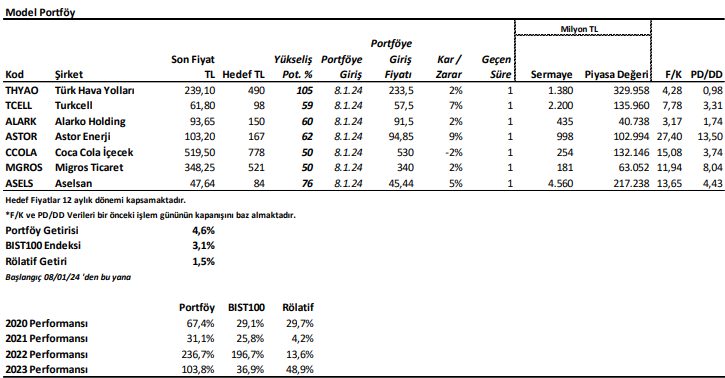 2023 yılını oldukça volatil geçirdiğimizi söylemek mümkün. Endeks yılın ilk yarısını aşağı yönlü satıcılı bir seyirle geçirirken seçim sonrasında güçlü bir ralli yaptı. Eylül ayında daha yatay bir endekse dönüşen BİST 100 endeksi Eylül sonrasında yine satıcılı bir seyir izledi. BİST 100 endeksi 2023 yılını %37 yükselişle kapatırken, Model Portföyümüz yılın başından bu yana %104’lük getiri sağladı. Böylece Model Portföyümüzün rölatif getirisi %49 oldu. Model Portföyümüzün getirisinin yılın başından bu yana olduğunu hatırlatmakta fayda var. 2024 yılı Model Portföyümüzü 8 Ocak açılış fiyatından yedi hisse ile başlatıyoruz.