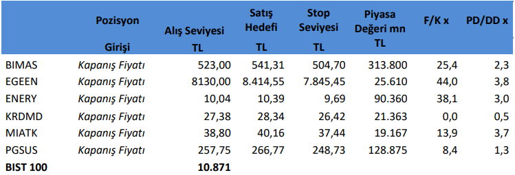 Takibimizdeki hisseler tamamen teknik analize göre belirlenmektedir. İşlem hacmi ve likiditesi yüksek 100 Endeks hisselerinden olmasına öncelik verilmektedir. Pozisyona giriş fiyatları Cuma günü kapanış seansında oluşan fiyatlardan yapılmaktadır. Hedefine ulaşmayan pozisyonlar stop loss seviyesinin altına inmediyse, bir sonraki Cuma günü kapanış fiyatından kapatılmaktadır. Belirlenen stop loss seviyeleri referans stop noktasıdır. Bu stop loss seviyesinin altında bir kapanış olması halinde referans değer gün sonu kapanış olarak alınacaktır.