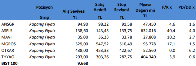 Takibimizdeki hisseler tamamen teknik analize göre belirlenmektedir. İşlem hacmi ve likiditesi yüksek 100 Endeks hisselerinden olmasına öncelik verilmektedir. Pozisyona giriş fiyatları Cuma günü kapanış seansında oluşan fiyatlardan yapılmaktadır. Hedefine ulaşmayan pozisyonlar stop loss seviyesinin altına inmediyse, bir sonraki Cuma günü kapanış fiyatından kapatılmaktadır. Belirlenen stop loss seviyeleri referans stop noktasıdır. Bu stop loss seviyesinin altında bir kapanış olması halinde referans değer gün sonu kapanış olarak alınacaktır.