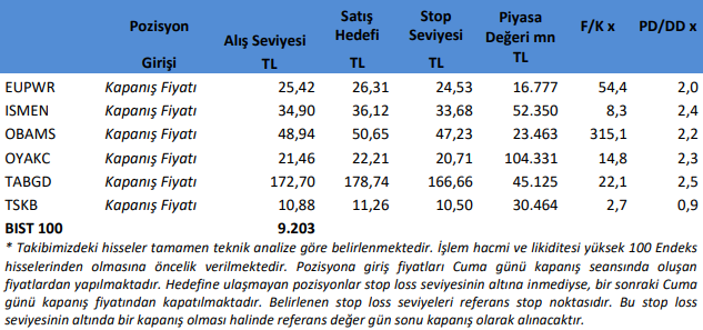 Takibimizdeki hisseler tamamen teknik analize göre belirlenmektedir. İşlem hacmi ve likiditesi yüksek 100 Endeks hisselerinden olmasına öncelik verilmektedir. Pozisyona giriş fiyatları Cuma günü kapanış seansında oluşan fiyatlardan yapılmaktadır. Hedefine ulaşmayan pozisyonlar stop loss seviyesinin altına inmediyse, bir sonraki Cuma günü kapanış fiyatından kapatılmaktadır. Belirlenen stop loss seviyeleri referans stop noktasıdır. Bu stop loss seviyesinin altında bir kapanış olması halinde referans değer gün sonu kapanış olarak alınacaktır.