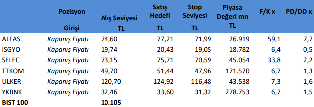 Takibimizdeki hisseler tamamen teknik analize göre belirlenmektedir. İşlem hacmi ve likiditesi yüksek 100 Endeks hisselerinden olmasına öncelik verilmektedir. Pozisyona giriş fiyatları Cuma günü kapanış seansında oluşan fiyatlardan yapılmaktadır. Hedefine ulaşmayan pozisyonlar stop loss seviyesinin altına inmediyse, bir sonraki Cuma günü kapanış fiyatından kapatılmaktadır. Belirlenen stop loss seviyeleri referans stop noktasıdır. Bu stop loss seviyesinin altında bir kapanış olması halinde referans değer gün sonu kapanış olarak alınacaktır.