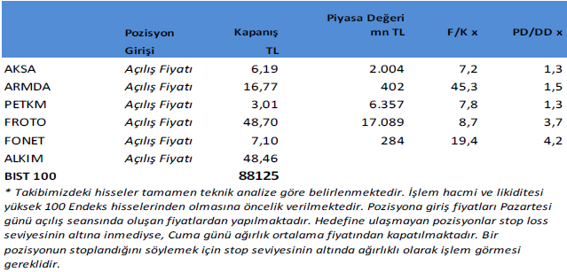 Not: Pozisyon girişleri Pazartesi açılış seansında oluşan fiyatlardan yapılacaktır. Giriş maliyetine göre satış hedefi ve stop loss seviyeleri belirlenecektir. Açılış seansının ardından tablomuz giriş fiyatları ile güncellenip tekrar gönderilecektir.