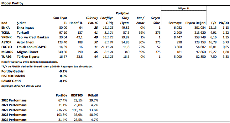 2025 yılında portföyümüzde ASTOR, EKGYO, MGROS ve TCELL’i korumaya devam ederken, ENKAI, YKBNK, ve TURSG’yi ekliyoruz. Model portföyden çıkardığımız THYAO, KCHOL, AKBNK’ı beğenmeye devam ediyoruz.