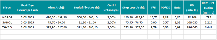 *Tablo yer alan fiyat sütunu verileri ile diğer veriler hisselerin portföye eklendiği tarihten önceki son işlem günü kapanış verileri üzerinden hesaplanmıştır.