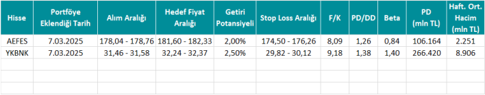 *Tablo yer alan fiyat sütunu verileri ile diğer veriler hisselerin portföye eklendiği tarihten önceki son işlem günü kapanış verileri üzerinden hesaplanmıştır.