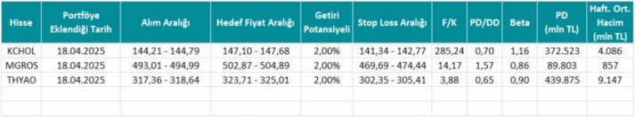 *Tablo yer alan fiyat sütunu verileri ile diğer veriler hisselerin portföye eklendiği tarihten önceki son işlem günü kapanış verileri üzerinden hesaplanmıştır.