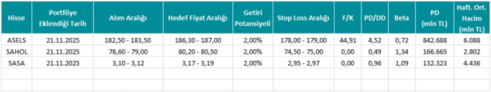 *Tablo yer alan fiyat sütunu verileri ile diğer veriler hisselerin portföye eklendiği tarihten önceki son işlem günü kapanış verileri üzerinden hesaplanmıştır.