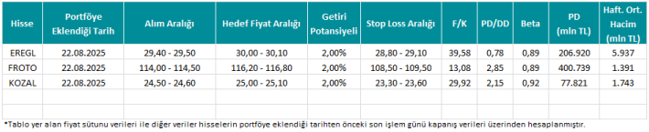 *Tablo yer alan fiyat sütunu verileri ile diğer veriler hisselerin portföye eklendiği tarihten önceki son işlem günü kapanış verileri üzerinden hesaplanmıştır.