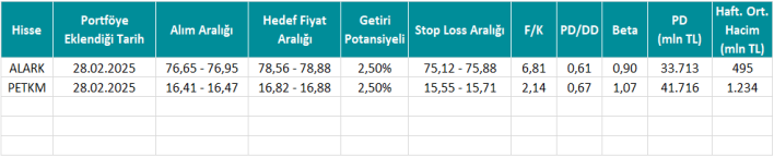 *Tablo yer alan fiyat sütunu verileri ile diğer veriler hisselerin portföye eklendiği tarihten önceki son işlem günü kapanış verileri üzerinden hesaplanmıştır.