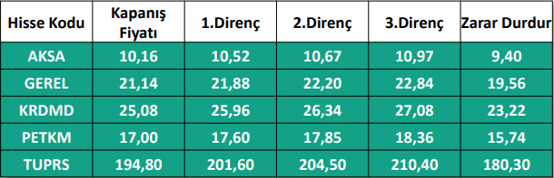 1) Haftalık Hisse Takip Listesinde yer alan hisse senetleri, Hedef Fiyat Aralığı ve Stop-Loss seviyeleri teknik analiz kriterlerine göre seçilmiştir. Liste içerisinden bireysel hisse senedi seçimi yapılması beklentilerinize uygun sonuçlar doğurmayabilir.