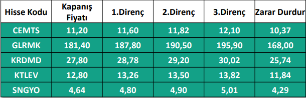 1) Haftalık Hisse Takip Listesinde yer alan hisse senetleri, Hedef Fiyat Aralığı ve Stop-Loss seviyeleri teknik analiz kriterlerine göre seçilmiştir. Liste içerisinden bireysel hisse senedi seçimi yapılması beklentilerinize uygun sonuçlar doğurmayabilir.