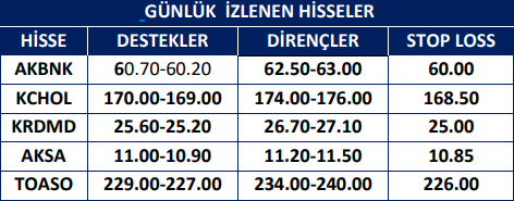 Borsada tepki çıkışı satışla karşılaştı. İlk destekler 10.870-10.820 olarak görülüyor. Bu seviyeler günlük işlemler için önemli. Sonraki destekler 10.700-10.680 ve 10.600 seviyelerinde. İlk dirençler 10.90-11.000 noktalarında görülüyor. Sonraki dirençler ise 11.100-11.150 seviyelerinde. Endekste tepki alımları görülebilir. Ancak direnç seviyelerinde satışla karşılaşma olasılığı yüksek.