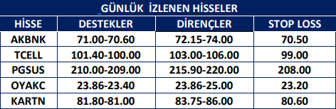 Endekste tepki alımları görüldü. İlk destekler 11.315-11.300 seviyelerinde. Bu seviyeler günlük işlemler için önemli. Sonraki destekler 11.250 ve 11.170-11.100 seviyelerinde bulunuyor. İlk dirençler ise 11.380-11.400 noktalarında. Sonraki dirençler 11.470 ve 11.550-11.605 seviyelerinde. Endekste görülen tepki alımlarının devamı beklenmekle birlikte direnç seviyelerinde satışla karşılaşabilir. Güne alıcılı başlanabilir.