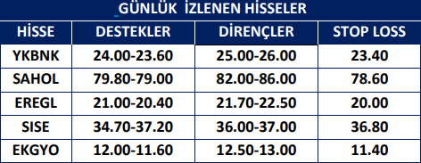 Borsada düşüş ve destek arayışı sürüyor. İlk destekler 9.00-8.900 olarak görülürken bu seviyeler günlük işlemlerde izlenebilir. Sonraki destekler 8.700-8.580 seviyelerinde. 8.700-8.580 daha önemli. İlk dirençler 9.100 ve 9.300 seviyelerinde bulunuyor. Sonraki dirençler 9.500 ve 9.700 noktalarında. Endekste son günlerdeki düşüşler tepki alımlarıyla karşılaşabilir. Ancak güç kazanması olasılığı zayıf.