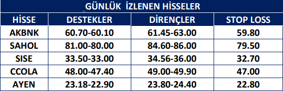 Endekste tepki çıkışı satış denemelerine rağmen korunuyor. İlk destekler 9.400-9.390 olarak bulunurken bu seviyeler günlük işlemler için önemli. Sonraki destekler 9.300 ve 9.100 seviyelerinde bulunuyor. İlk dirençler ise 9.480-9.510 seviyelerinde. Sonraki dirençler 9.600-9.650 ve 9.730 seviyelerinde görülüyor. Endekste tepki yükselişi gücünü korumakla birlikte direnç seviyelerinde satışlar görülebilir.