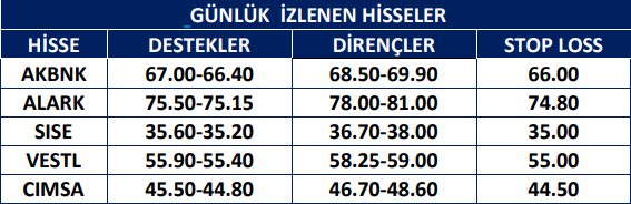 Endekste trend destek noktalarından tepki yükselişi görüldü. İlk destekler 9.550-9.500 ve 9.420 olarak görülürken bu seviyeler günlük işlemler için izlenebilir. Sonraki destekler 9.300-9.200 seviyelerinde. İlk dirençler ise 9.600-9.630 seviyelerinde bulunuyor. Sonraki dirençler 9.710 ve 9.850 seviyelerinde. Endekste tepki çıkışının devamı beklenmekle birlikte direnç seviyelerinde satışlar görülebilir.