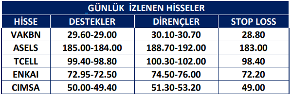 Endekste çıkış trendi devam ediyor. İlk destekler 11.500-11.490 ve 11.430 olarak görülürken bu seviyeler günlük işlemler için önemli. Sonraki destekler 11.400-11.300 noktalarında bulunuyor. İlk dirençler ise 11.600-11.650’de Sonraki dirençler 11.800-12.000 seviyelerinde. Endekste direnç noktalarında satış denemeleri görülse de çıkış hareketinin devamı beklenebilir.