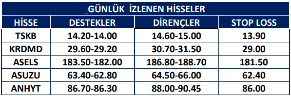 Endekste düşüş derinlik kazanmadı, çıkış trendi korunuyor. İlk destekler 11.350 ve 11.290 olarak görülürken bu seviyeler günlük işlemler için önemli. Sonraki destekler 11.250-11.200 noktalarında bulunuyor. İlk dirençler ise 11.400 ve 11.470 seviyelerinde. Sonraki dirençler 11.550-11.600’de. Endekste destek noktalarında tepki alımları görülse de direnç seviyelerinde satışla karşılaşma olasılığı yüksek.