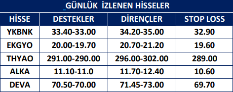 Borsada tepki çıkışı görüldü. İlk destekler 10.950-10.920 olarak görülüyor. Bu seviyeler günlük işlemler için önemli. Sonraki destekler 10.820-10.800 ve 10.700 seviyelerinde. İlk dirençler 11.000 ve 11.150 noktalarında görülüyor. Sonraki dirençler ise 11.300-11.350 ve 11.600 seviyelerinde. Endekste tepki çıkışı direnç seviyelerinde satışla karşılaşabilir.