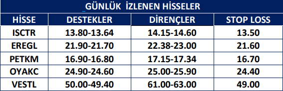 Endeksteki sert düşüş tepki alımlarıyla karşılaştı. İlk destek 9.790-9.750 olarak görülürken bu seviyeler günlük işlemler için izlenebilir. Sonraki destekler 9.670-9.580 seviyelerinde. İlk dirençler ise 9.900 ve 9.950-10.000 seviyelerinde bulunuyor. Sonraki dirençler 10.100-10.150 seviyelerinde. Endekste görülen tepki alımları henüz güç kazanmamakla birlikte direnç seviyelerinde satışla karşılaşabilir.