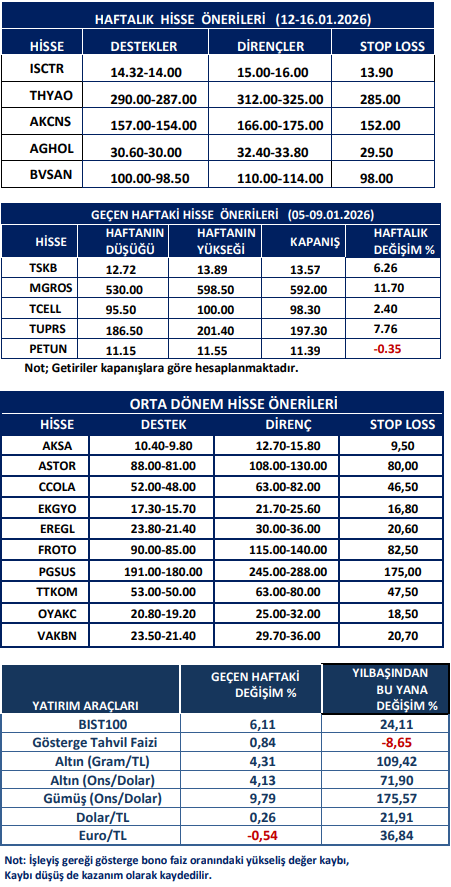 2026 yılına iyi başlayan Borsa İstanbul’da çıkış hareketi yeni zirve denemeleriyle devam ediyor. Dış borsalardan daha pozitif bir görünüm ve olumlu ayrışma söz konusu. Bunu geçtiğimiz yıl dış borsalar rekorlar kırarken BIST100 Endeksi’nin baskı altında kalmasına yormakta yarar var. Geçen hafta açıklanan aralık ayına ait enflasyon verileri (TÜFE) beklentilerin altında kalınca 22 Ocak’taki TCMB toplantısına ilişkin faiz indirim olasılığı arttı. Faizde 100-150 baz puanlık indirim öngörüleri hakim. Borsanın en ciddi rakiplerinden biri faizdir. Bu açıdan faiz düştükçe borsaya ilginin artmasını beklemek yerinde olacak. Bu durum BIST100 Endeksi’nde çıkışı destekleyen en önemli gerekçe olarak görülüyor. Diğer yandan 23 Ocak’ta Fitch ve Moody’s’den gelecek Türkiye’nin kredi notuna ilişkin değerlendirmeler yakından takip edilecek. Görünüm veya kredi notunda olası bir iyileşme olumlu havayı destekleyici olabilir. Dış finans çevrelerinin bakışını yansıtan ve düşüş eğilimini sürdüren Türkiye’nin ülke risk puanı (CDS) 200 seviyesine oldukça yaklaşmış durumda. Diğer yandan ocak ayı sonuna doğru 12/2025 dönem bilançoları yayınlanmaya başlayacak. Hatırlanırsa 09/2025 şirket bilançoları önceki dönemlere göre daha olumlu gelmişti. Enflasyon muhasebesinin bilançolar üzerindeki etkisinin önceye göre nispeten azalmasının da payını dikkate almak gerekir. Borsadaki çıkışta işlem hacmi artışının sınırlı kaldığı, yükselişin çok fazla genele yayılmadığı gibi görüşler mevcut. Ancak uzun zamandır kırılmayan zirve geçildi. Borsada önce lokomotifler gider, sonra diğer hisseler onu izler gibi önceden beri var olan bir anlayış da mevcut. Yeni zirve denemelerine rağmen yükseklik korkusu henüz görülmüyor, ucuz ve primsiz algısı çok fazla değişmiş değil. Ucuzluk göreceli bir kavram. Ancak dolar, gram altın ve TÜFE bazlı BIST100 grafiklerine bakıldığında halen zirvelerden çok uzaklarda olunduğu görülecektir. Ekonomik olarak olumlu olarak değerlendirdiğimiz konu başlıklarının fiyatlanması için dış kaynaklı jeopolitik gelişmelerle iç siyasette daha sakin seyre ihtiyaç olacağı muhakkak. TCMB tarafından açıklanan parasal istatistikler ve yabancı işlemleri piyasanın önemli verileri arasındaki yerini koruyor. 2 Ocak ile biten haftada; Yabancı yatırımcılar 102 milyon dolar hisse senedi, 288 milyon dolar tahvil bono aldılar. Hisse senetlerindeki alımlar 5 haftadır aralıksız sürmekle birlikte toplamda 919 milyon dolara ulaştı. Yabancılar son haftalarda tercihlerini tahvil bonodan çok hisse senetlerinden yana kullanıyor. Önümüzdeki hafta açıklanacak verilerde de hisse senetlerinde yabancı alımlarının devamı muhtemeldir. Yine 2 Ocak ile biten haftada, TCMB brüt rezervlerinde 4.7 milyar dolar, yurtiçi yerleşiklerin döviz mevduatında 1.1 gerileme vardı. TCMB brüt rezervlerindeki gerilemede altın fiyatlarındaki düşüş ile birlikte bir miktar döviz satışı olduğu anlaşılıyor. TCMB brüt rezervleri 193 milyar dolardan 189 milyar dolara gerilerken yurtiçi yerleşiklerin döviz mevduatı 220 milyar dolara çekildi.