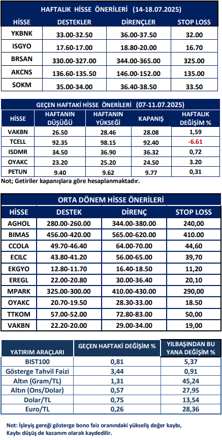 4 Temmuz ile biten haftada; Yabancı yatırımcılar hisse senetlerinde 234 milyon dolar, tahvil bonoda 2.377 milyon dolarlık alım yaptılar. CHP kurultay davasının ertelenmesi sonrası borsada görülen sert yükselişle yabancı alımlarının devamı beklenen bir gelişmeydi. Tahvil bonoda son dört hafta art arda gelen alımlarla toplam tutar 4 milyar dolara yaklaştı. Hisse senetlerinde iki haftadır yabancıların alımı 482 milyon dolar oldu. Aynı hafta TCMB rezervlerinde yaklaşık 10 milyar dolarlık toparlanma gözlenirken brütte 164,4 milyar dolar, swap hariç nette 38.1 milyar dolara ulaşıldı. 19 Mart süreciyle kaybedilen rezervlerin ciddi bir kısmı geri kazanıldı. Diğer yandan yurtiçi yerleşiklerin döviz mevduatında ise 2.9 milyar dolarlık gerileme söz konusu. Faiz indirim beklentilerine karşılık döviz mevduatındaki düşüş kayda değer.