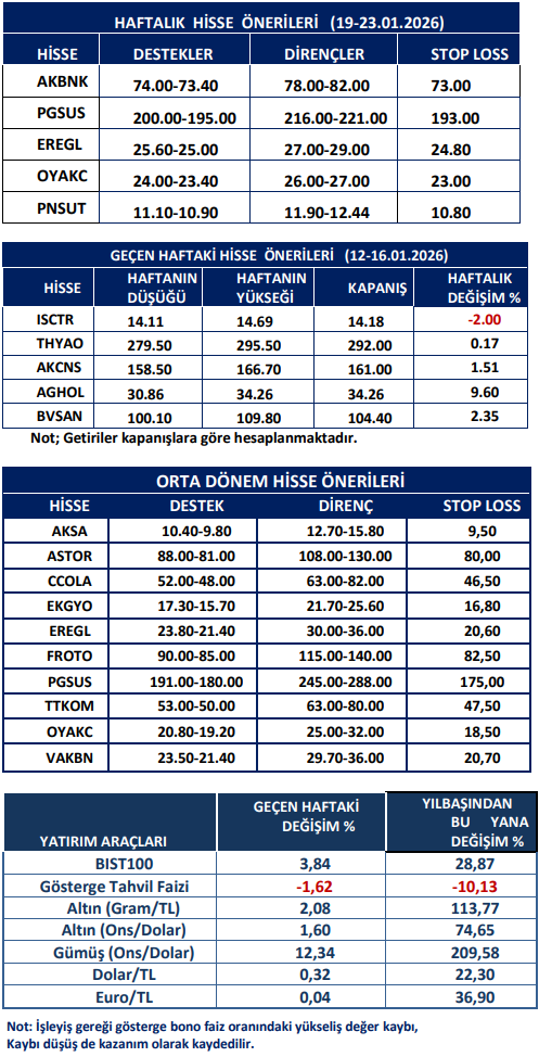 Dış piyasalarda iyimserlik ivme kaybetmesine rağmen korunuyor. ABD Başkanı Trump’ın İran’a müdahale uyarıları gerginlik yaratmış ve borsalara kâr satışı, güvenli limanlara ise fiyat artışı olarak yansıma göstermişti. Ancak son günlerde Trump’ın İran’a ilişkin tavrındaki yumuşama sinyali borsalar tarafından olumlu fiyatlanırken altın, gümüş ve kıymetli metal fiyatlarındaki yükseliş hız kesmişti. Trump, “İran’da infazlar durdu bilgisini aldık” derken bu açıklama olası bir askeri harekatın ertelendiği veya askıya alındığı şeklinde değerlendirildi. Fakat Grönland konusunda ABD Başkanı Trump’ın 8 Avrupa ülkesine gümrük vergisi getirmesi gerginliği artırdı. Bu açıdan önümüzdeki hafta yine jeopolitik gelişmeler izlenecek ve fiyatlamalarda önemli konu başlıklarından biri olması muhtemel görünüyor.