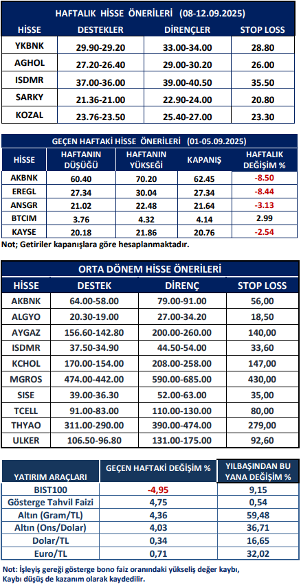 Dış piyasalar Cuma günü açıklanan ABD tarım dışı istihdam verilerine odaklandı. Beklenti 75 bin iken gerçekleşme 22 bin olarak açıklandı. Önceki ay 73 bindi. Hafta içinde açıklanan diğer istihdam verileri de zayıf geldi. İstihdam verileri ekonomideki durgunluğa işaret ederken Fed faiz indirim beklentilerini güçlendirdi. Bu durum en çok altın fiyatlarına yaradı. Veri sonrası altın fiyatlarında yükseliş devam etti. Son günlerde bir miktar kâr satışları söz konusuydu. Gümüş de ivmesi daha zayıf olmakla birlikte altını takip etti. Dolarda zayıflama, ABD tahvil faizlerinde ise düşüş gözlendi. Dolar euro başta olmak üzere sterlin ve Japon yenine karşı değer kaybetti. Borsalardaki düşüşü ise ekonomik aktivitedeki zayıflıkla izah etmek gerekecek. Fed faiz karaları için enflasyon ve istihdam verilerinin ağırlığı bilinen bir durum. ABD tarım dışı istihdam verilerinin çok düşük gelmesiyle cılız da olsa Ekim toplantısı için bir faiz indirimi olasılığı dillendirilmeye başlandı. Piyasalar şimdiye kadar Eylül ve Aralık toplantılarını fiyatlama konusu yapmıştı. Ekim olasılığı güçlenirse bunun olumlu yansımalarını borsalar ve altın fiyatları üzerinde görebiliriz.