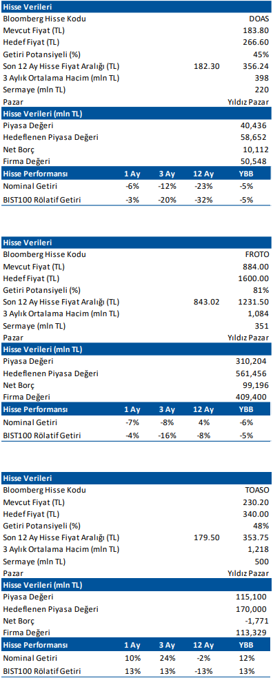 ■ Doğuş Otomotiv için 12-aylık hedef fiyatımız 266,60 TL, önerimiz, TUT yününde. Hisse, yıl başından itibaren BIST 100 Endeksi’nin %5 gerisinde performans göstermiştir. Geriye dönük 12 aylık verilere göre hisse 3,9x F/K ve 3,0x FD/FAVÖK çarpanlarıyla işlem görmektedir.
