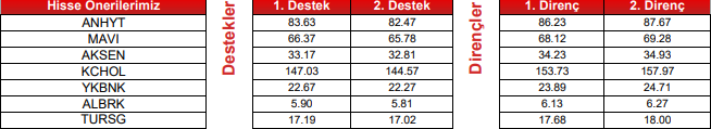 Endeks, dün gerçekleşen işlemlerde 63,08 puan yükselişle 9,338 puan seviyesinden kapanış gerçekleştirdi. Endeksin 9,570 direnç seviyesine doğru tepki yükselişi beklenebilir. Gün içi ilk direnç noktası 9,450 puan seviyesidir. Sonraki direnç noktası ise 9,570 puan seviyesidir. Gün içi ilk destek noktası 9,330 puan seviyesidir. Sonraki destek noktası 9,210 puan seviyesidir. Teknik öneri listemizden AEFES %-7.12 (relatif %3.82), ANSGR %-9.72 (relatif %6.58) çıkartıp, ALBRK ve TURSG’yi ekliyoruz.