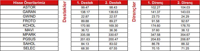Endeks, dün gerçekleşen işlemlerde 44,47 puan düşüşle 11,193 puan seviyesinden kapanış gerçekleştirdi. Endeksin 11,080 destek seviyesi üzerinde yükseliş eğilimi korunabilir. Gün içi ilk direnç noktası 11,270 puan seviyesidir. Sonraki direnç noktası ise 11,350 puan seviyesidir. Gün içi ilk destek noktası 11,180 puan seviyesidir. Sonraki destek noktası 11,080 puan seviyesidir. Teknik öneri listemize MAVI’yi ekliyoruz.