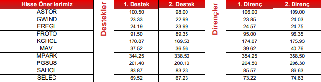 Endeks, dün gerçekleşen işlemlerde 39,78 puan yükselişle 11,233 puan seviyesinden kapanış gerçekleştirdi. Endeksin 11,080 destek seviyesi üzerinde yükseliş eğilimi korunabilir. Gün içi ilk direnç noktası 11,290 puan seviyesidir. Sonraki direnç noktası ise 11,350 puan seviyesidir. Gün içi ilk destek noktası 11,190 puan seviyesidir. Sonraki destek noktası 11,080 puan seviyesidir. Teknik öneri listemizden GARAN ı çıkartıp, EREGL’yi ekliyoruz.