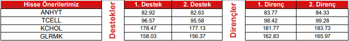 Endeks, dün gerçekleşen işlemlerde 83,82 puan düşüşle 10,954 puan seviyesinden kapanış gerçekleştirdi. Endeksin olası direnç seviyelerine yükselişlerde kar satışı denenebilir. Gün içi ilk direnç noktası 11,050 puan seviyesidir. Sonraki direnç noktası ise 11,130 puan seviyesidir. Gün içi ilk destek noktası 10,870 puan seviyesidir. Sonraki destek noktası 10,770 puan seviyesidir.
