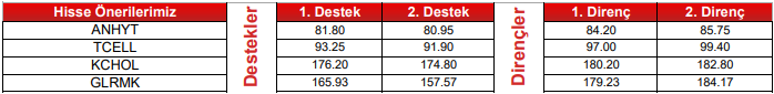 Endeks, dün gerçekleşen işlemlerde 125,40 puan düşüşle 10,824 puan seviyesinden kapanış gerçekleştirdi. Endeksin 10,770 destek seviyesinde dengelenme beklenebilir. Gün içi ilk direnç noktası 10,940 puan seviyesidir. Sonraki direnç noktası ise 11,040 puan seviyesidir. Gün içi ilk destek noktası 10,770 puan seviyesidir. Sonraki destek noktası 10,640 puan seviyesidir.