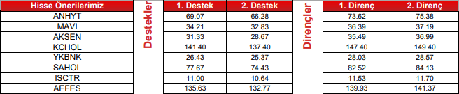 Endeks, Cuma günü gerçekleşen işlemlerde 208,34 puan düşüşle 9,311 puan seviyesinden kapanış gerçekleştirdi. Endeksin 9,400 direnç seviyesi altında negatif görünüm sürebilir. Gün içi ilk direnç noktası 9,400 puan seviyesidir. Sonraki direnç noktası ise 9,500 puan seviyesidir. Gün içi ilk destek noktası 9,100 puan seviyesidir. Sonraki destek noktası 9,000 puan seviyesidir.