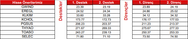 Endeks, dün gerçekleşen işlemlerde 62,02 puan düşüşle 11,286 puan seviyesinden kapanış gerçekleştirdi. Endeksin 11,230 ile 11,500 seviyeleri arasında dalgalı bir seyir beklenebilir. Gün içi ilk direnç noktası 11,370 puan seviyesidir. Sonraki direnç noktası ise 11,500 puan seviyesidir. Gün içi ilk destek noktası 11,230 puan seviyesidir. Sonraki destek noktası 11,130 puan seviyesidir.