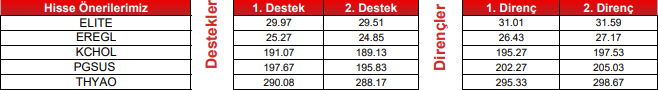 Endeks, dün gerçekleşen işlemlerde 57,93 puan yükselişle 12,805 puan seviyesinden kapanış gerçekleştirdi. Endeksin 12,700 destek seviyesi üzerinde yükseliş eğiliminin korunması beklenebilir. Gün içi ilk direnç noktası 12,910 puan seviyesidir. Sonraki direnç noktası ise 13,020 puan seviyesidir. Gün içi ilk destek noktası 12,700 puan seviyesidir. Sonraki destek noktası 12,600 puan seviyesidir.