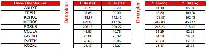 Endeks, dün gerçekleşen işlemlerde 275,63 puan yükselişle 10,484 puan seviyesinden kapanış gerçekleştirdi. Endeksin 10,390 destek seviyesi üzerinde tepki yükselişini sürdürmesi beklenebilir. Gün içi ilk direnç noktası 10,680 puan seviyesidir. Sonraki direnç noktası ise 10,830 puan seviyesidir. Gün içi ilk destek noktası 10,390 puan seviyesidir. Sonraki destek noktası 10,280 puan seviyesidir.