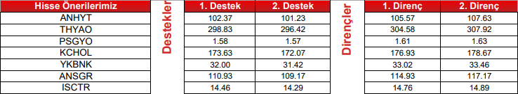 Endeks, dün gerçekleşen işlemlerde 29,76 puan düşüşle 9,999 puan seviyesinden kapanış gerçekleştirdi. Endeksin 9,940 destek seviyesi üzerinde yükseliş eğilimi korunabilir. Gün içi ilk direnç noktası 10,090 puan seviyesidir. Sonraki direnç noktası ise 10,160 puan seviyesidir. Gün içi ilk destek noktası 9,950 puan seviyesidir. Sonraki destek noktası 9,910 puan seviyesidir.