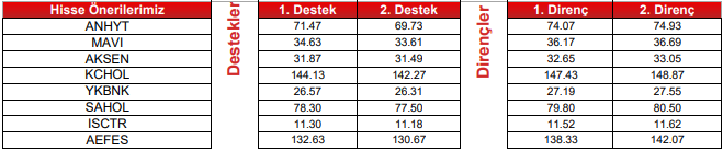 Endeks, Cuma günü gerçekleşen işlemlerde 101,35 puan yükselişle 9,203 puan seviyesinden kapanış gerçekleştirdi. Endeksin 9,320 direnç seviyesi altında negatif görünüm sürebilir. Gün içi ilk direnç noktası 9,260 puan seviyesidir. Sonraki direnç noktası ise 9,320 puan seviyesidir. Gün içi ilk destek noktası 9,065 puan seviyesidir. Sonraki destek noktası 8,940 puan seviyesidir.