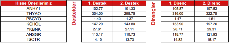 Endeks, Cuma günü gerçekleşen işlemlerde 205,34 puan düşüşle 9,602 puan seviyesinden kapanış gerçekleştirdi. Endeksin 9,710 direnç seviyesine doğru tepki yükselişi beklenebilir. Gün içi ilk direnç noktası 9,710 puan seviyesidir. Sonraki direnç noktası ise 9,900 puan seviyesidir. Gün içi ilk destek noktası 9,580 puan seviyesidir. Sonraki destek noktası 9,470 puan seviyesidir.