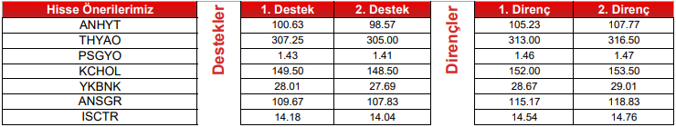 Endeks, dün gerçekleşen işlemlerde 27,33 puan düşüşle 9,574 puan seviyesinden kapanış gerçekleştirdi. Endeksin 9,710 direnç seviyesine doğru tepki yükselişi beklenebilir. Gün içi ilk direnç noktası 9,710 puan seviyesidir. Sonraki direnç noktası ise 9,900 puan seviyesidir. Gün içi ilk destek noktası 9,540 puan seviyesidir. Sonraki destek noktası 9,470 puan seviyesidir.