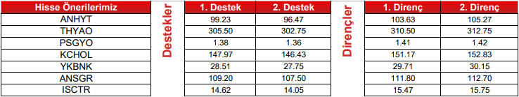 Endeks, dün gerçekleşen işlemlerde 121,63 puan yükselişle 9,573 puan seviyesinden kapanış gerçekleştirdi. Endeksin 9,760 direnç seviyesine doğru tepki yükselişinin sürmesi beklenebilir. Gün içi ilk direnç noktası 9,680 puan seviyesidir. Sonraki direnç noktası ise 9,760 puan seviyesidir. Gün içi ilk destek noktası 9,520 puan seviyesidir. Sonraki destek noktası 9,400 puan seviyesidir.