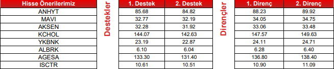 Endeks, Cuma günü gerçekleşen işlemlerde 58,35 puan düşüşle 9,432 puan seviyesinden kapanış gerçekleştirdi. Endeksin 9,430 destek seviyesi üzerinde yükseliş eğilimi korunabilir. Gün içi ilk direnç noktası 9,530 puan seviyesidir. Sonraki direnç noktası ise 9,650 puan seviyesidir. Gün içi ilk destek noktası 9,430 puan seviyesidir. Sonraki destek noktası 9,300 puan seviyesidir.