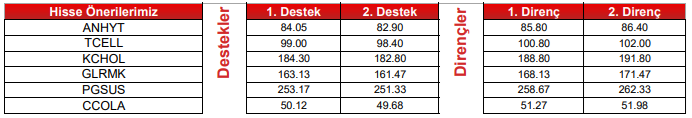Endeks, dün gerçekleşen işlemlerde 170,80 puan düşüşle 11,359 puan seviyesinden kapanış gerçekleştirdi. Endeksin destek seviyelerine doğru olası düşüşlerde tepki amaçlı alım denenebilir. Gün içi ilk direnç noktası 11,480 puan seviyesidir. Sonraki direnç noktası ise 11,620 puan seviyesidir. Gün içi ilk destek noktası 11,340 puan seviyesidir. Sonraki destek noktası 11,220 puan seviyesidir.
